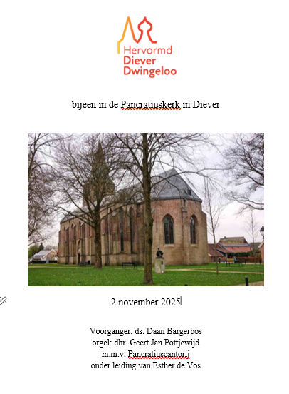 zondag 2 november 2025 om 10:00 uurDs. Daan Bargerbos. Gedachtenisdienst Pancratiuskerk in DieverVoorganger(s): ds. Daan Bargerbos Organist: Geert Jan Pottjewijd |
