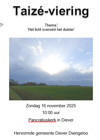 zondag 16 november 2025 om 10:00 uurTaizé viering, georganiseerd door eigen gemeenteleden, Pancratiuskerk in DieverVoorganger(s): Werkgroep Bezinning en Inspiratie Organist: Andries Kamphof |